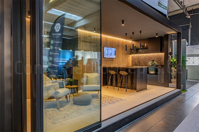 Le « Colorado » est notre modèle standard de pool house, équipé d’une douche, d’une pièce séparée pour les toilettes ou le rangement, d’un îlot, d’un coin salon et d’une cuisine. En outre, une fenêtre coulissante en verre a été installée sur tout le côté transversal et ce concept a été équipé de prises de courant et de points lumineux placés à des endroits stratégiques. L’unité mesure 9 m (L) x 2,44 m (l) x 2,89 m (h) et peut être adaptée à vos besoins.