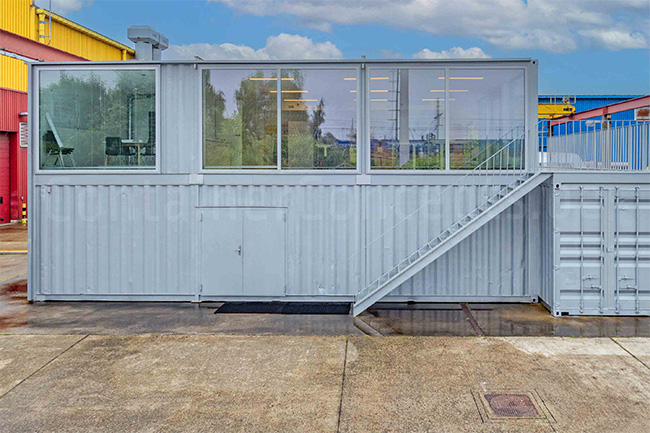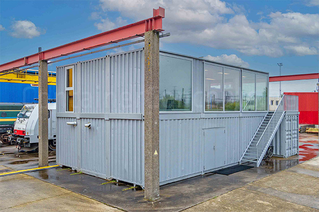 Pour Railpool, une société de location de locomotives et autres wagons, nous avons construit un bureau en conteneur sur leur site. Cet ensemble de conteneurs abrite un espace de bureaux avec une salle de réunion et une cuisine entièrement équipée. Le tout était placé au-dessus d’un vaste espace de stockage.