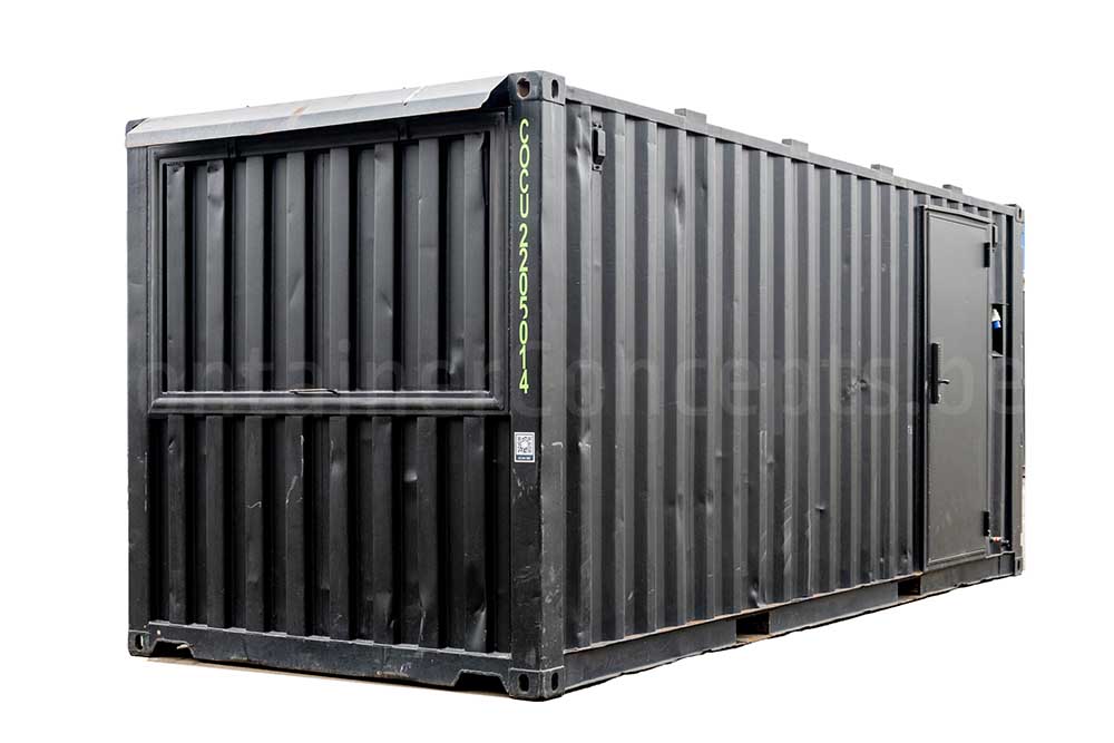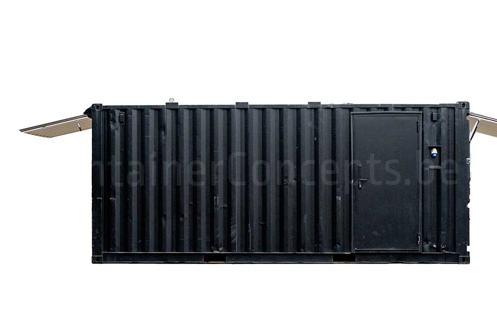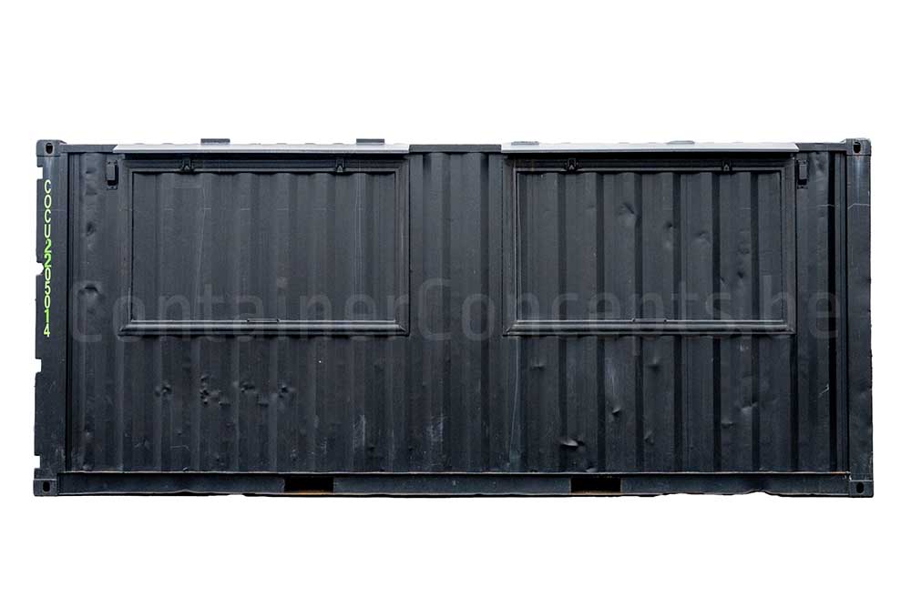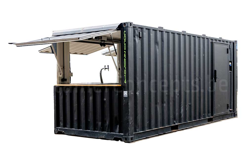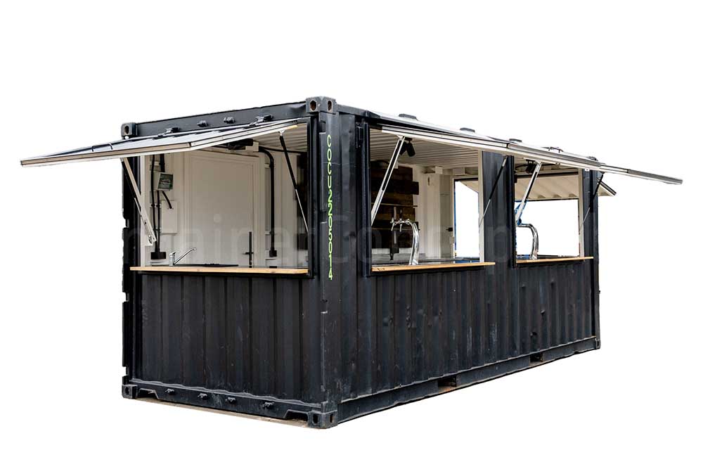 Ce conteneur maritime de 20 ft a été transformé en un véritable bar container, idéal pour les événements, festivals, zones de food trucks ou installations temporaires de restauration. Le conteneur est équipé de quatre larges guichets : deux sur les extrémités et deux sur l’un des côtés longs. Sur l’autre côté long, une porte d’accès a été installée pour le personnel.
