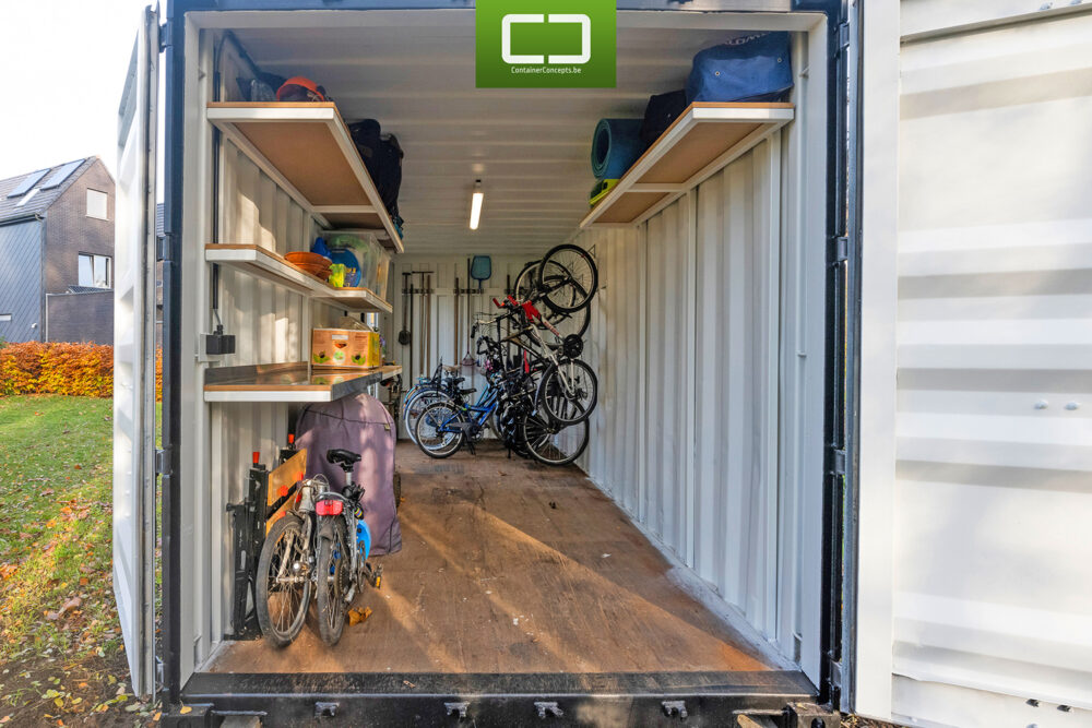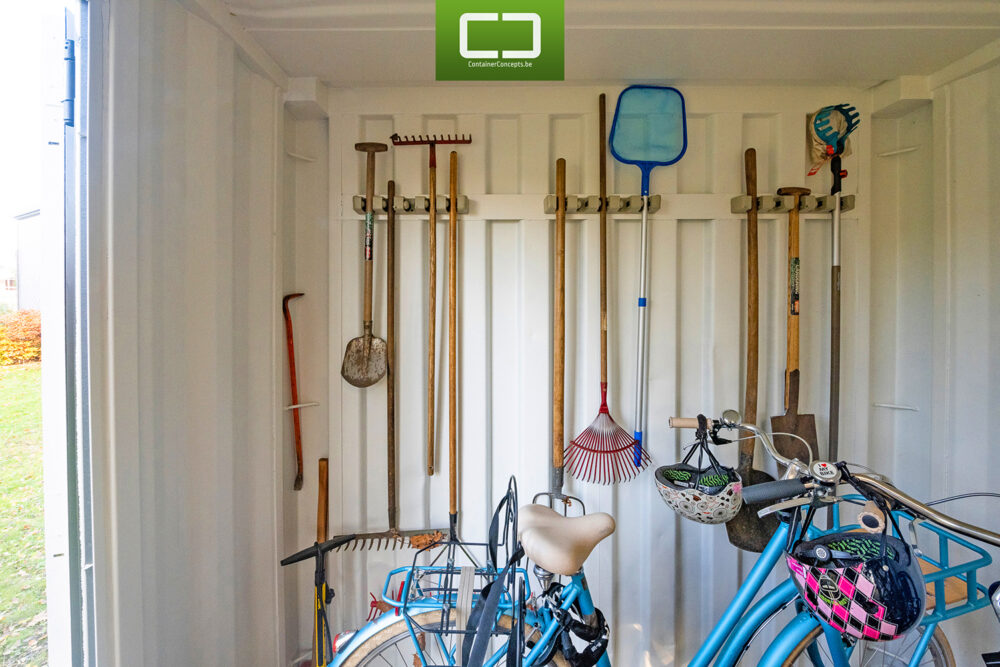 Voor deze klant hebben wij een 20ft 1 gebruikte zeecontainer omgebouwd naar een tuinhuis. Deze is voorzien van een extra stalen loopdeur in de zijwand, schabben op maat, fiets haken binnenin en de nodige elektro. Biedt ruime opslag voor tuingereedschap en hobbymateriaal.