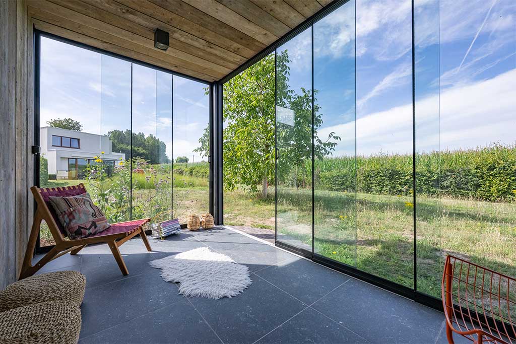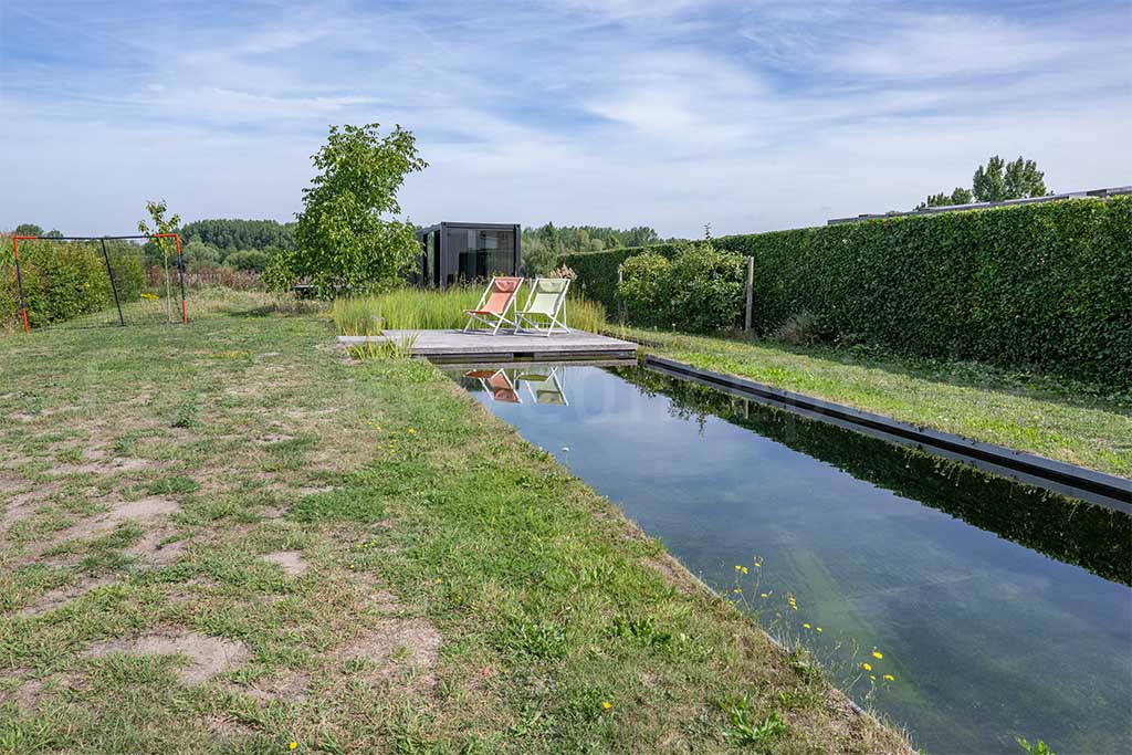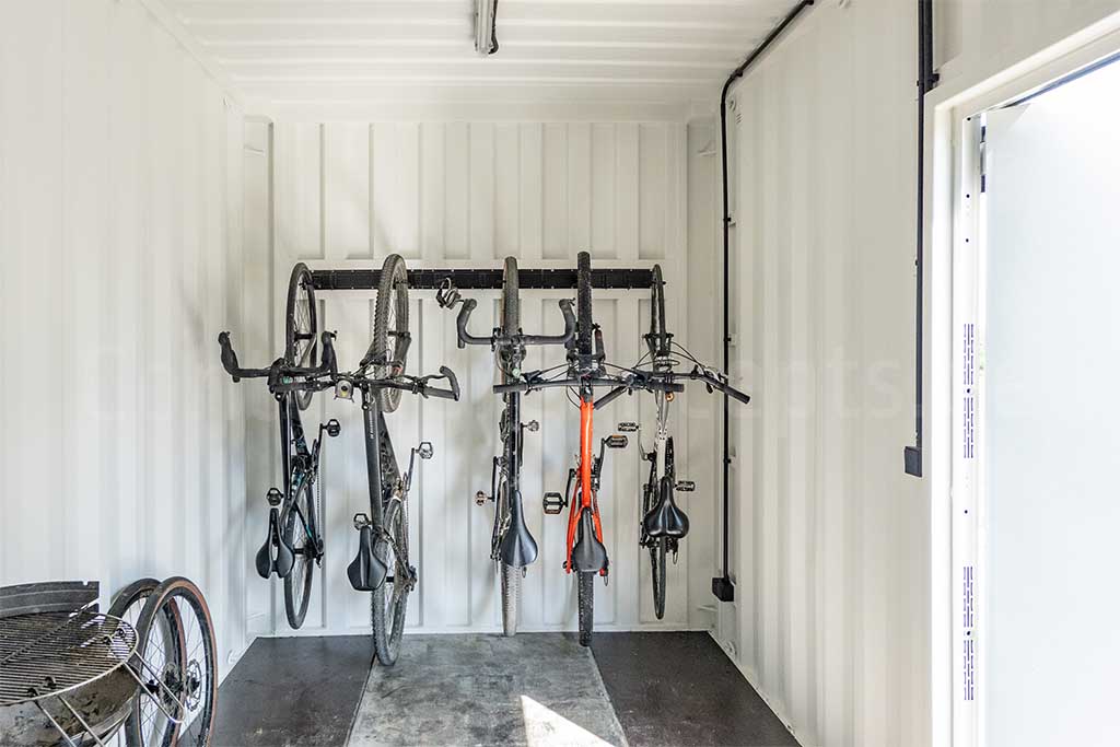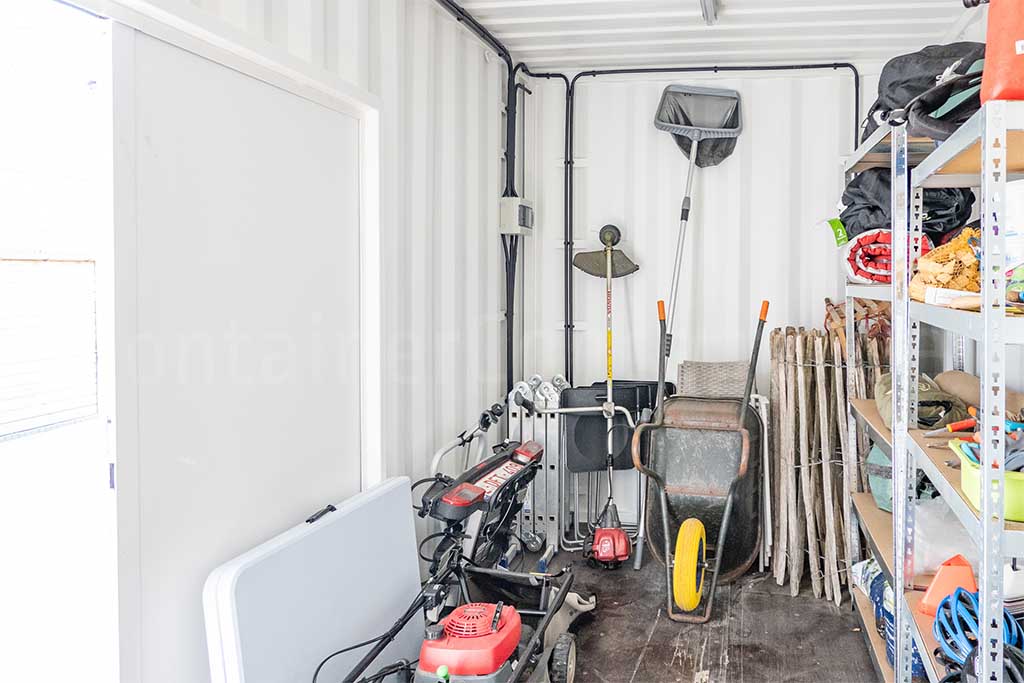 Deze 40ft container werd opgesplitst in twee afzonderlijke delen die samen een praktische en sfeervolle oplossing vormen. Het eerste deel werd ingericht als een gezellige lounge, waarbij zowel de kopse kant als de zijkant zijn voorzien van schuiframen. Hierdoor ontstaat een lichte en open ruimte waar je in elk seizoen comfortabel kunt genieten van een overdekte lounge. Binnenin werd de vloer betegeld, zijn de wanden en het plafond afgewerkt met steigerhout en zorgen ingebouwde spots voor een warme en uitnodigende sfeer. Het tweede deel van de container werd ingericht als ruime berging, ideaal voor het opslaan van tuingereedschap, materialen en andere benodigdheden, en is bovendien voorzien van een fietsenrek. Op deze manier combineert de container ontspanning en functionaliteit in één duurzame en stijlvolle oplossing.